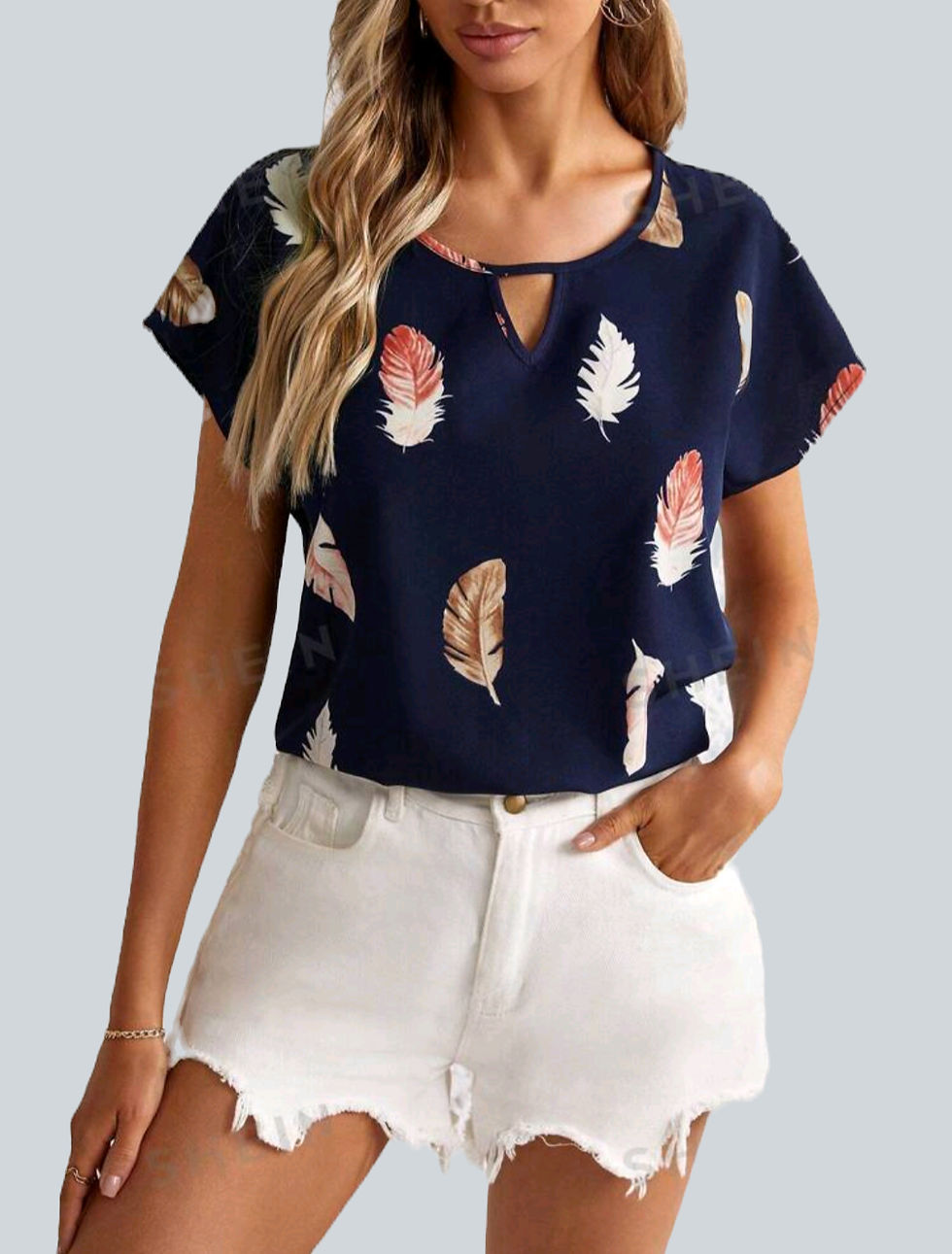 Feather Print Keyhole Neck Batwing Sleeve Blouse